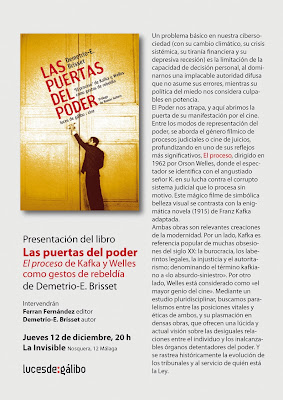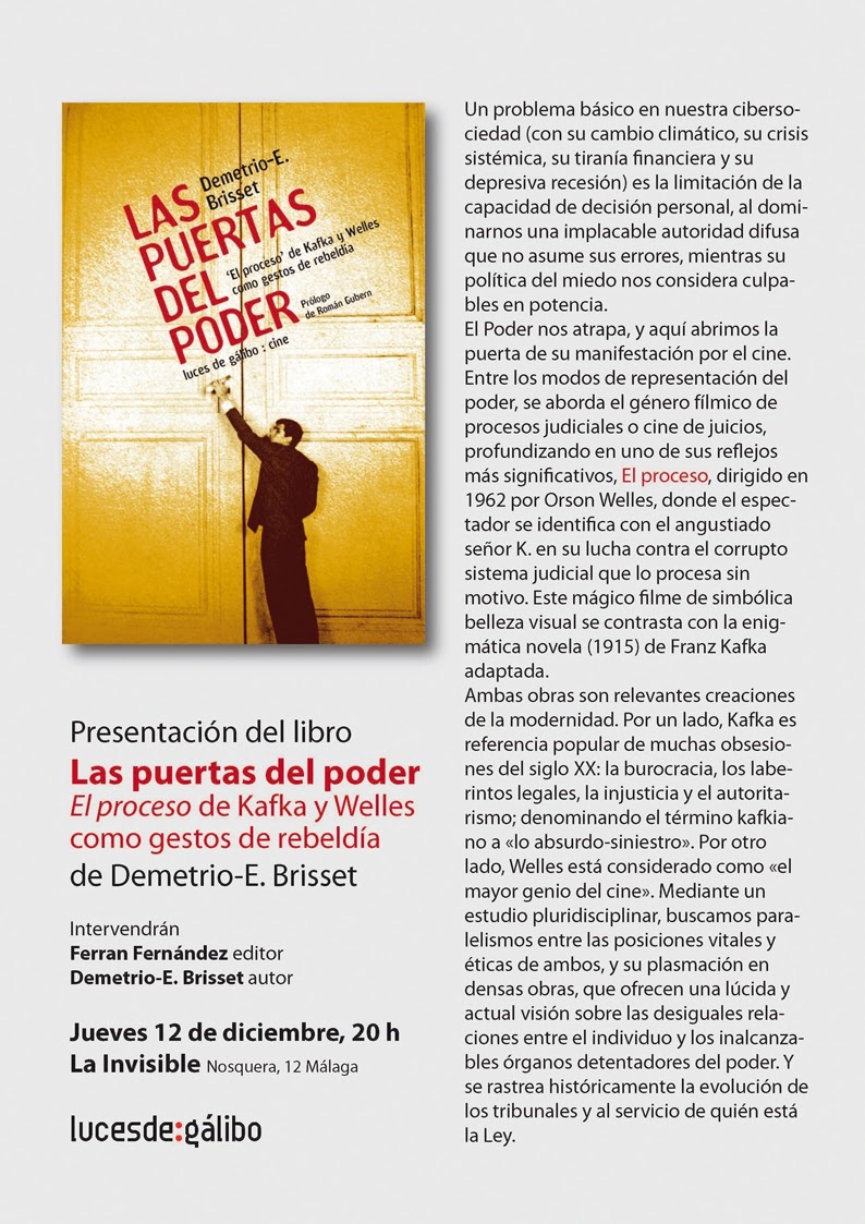 El Poder nos atrapa, y aquí abrimos la puerta de su manifestación por el cine. Entre los modos de representación del poder, se aborda el género fílmico de procesos judiciales o cine de juicios, profundizando en uno de sus reflejos más significativos, El proceso, dirigido en 1962 por Orson Welles, donde el espectador se identifica con el angustiado señor K. en su lucha contra el corrupto sistema judicial que lo procesa sin motivo. Este mágico filme de simbólica belleza visual se contrasta con la enigmática novela (1915) de Franz Kafka adaptada.